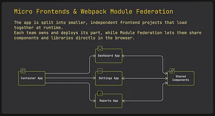 Micro frontends let each team build and deploy their part of the app separately. For example, one team handles the dashboard while another builds the settings page. Technically, the app is divided into smaller frontend projects that are combined at runtime to work as one seamless app.