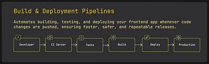 Section titled “17 Build & Deployment Pipelines (CI/CD for Frontend)”Frontend apps also benefit from CI/CD (Continuous Integration and Continuous Deployment) pipelines, just like backend services. These pipelines automatically handle steps like building the app, running tests, and deploying updates.