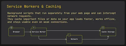 - Service workers run in the background to cache important files like HTML, CSS, and API responses.