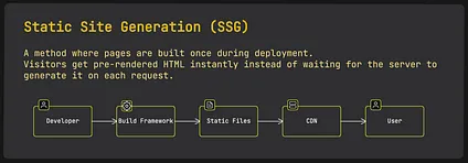 SSG solves this by pre-building the HTML when you deploy your site. The system can fetch data during the build process, even for pages with dynamic content, which means all content is baked into static HTML files before any user visits them.