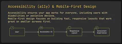 Section titled “18 Accessibility (a11y) & Mobile-First Design”Accessibility and mobile-first design aren’t just design principles; they’re system-level considerations. Accessibility ensures your app’s UI and code structure work for everyone, including people using assistive technologies.