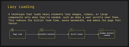 Section titled “8 Lazy Loading”Of course, fast pages aren’t just about metrics; they’re also about smart resource management.