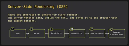 Unlike Static Site Generation (SSG), which is great for mostly static pages, SSR is useful when content needs to stay fresh or personalised. For example, dashboards, user profiles, or live feeds. Because the system generates pages in real time, they always display the latest data instead of relying on pre-built files.