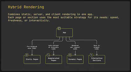 Different parts of your app might have different needs. For example, some pages stay mostly the same, while others need fresh or personalised data. That’s where hybrid rendering comes in.