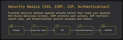 Section titled “20 Security Basics (XSS, CSRF, CSP, Authentication)”Speed means nothing without security. Frontend isn’t just about the UI; it’s also the first line of defence for your app.