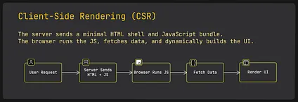Section titled “4 Client-Side Rendering (CSR)”CSR means the browser does most of the work instead of the server. The server sends only a basic HTML page and some JavaScript. The browser then loads the data and builds the page on the fly.