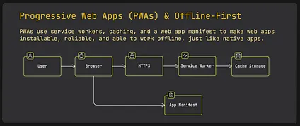 Section titled “19 Progressive Web Apps (PWAs) & Offline-First”Progressive Web Apps (PWAs) are web apps that behave like native apps. They can work offline, send notifications, and even be installed on a device.