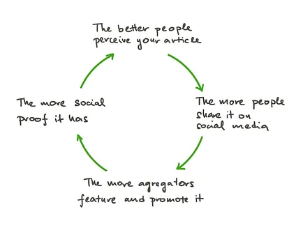 The higher quality something is in terms of the underlying ideas and how it is packaged, the more likely it is to be shared over and over, which then makes it more likely that other publications will syndicate it, republish it, promote it through their social media and email channels, write about it, and feature it on their frontpage.