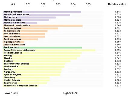 Section titled “The Equal-Odds Rule Applies To Other Creative Fields”A 2020 follow-up study, Success and luck in creative careers, confirmed the suspicion for how important chance is across fields: