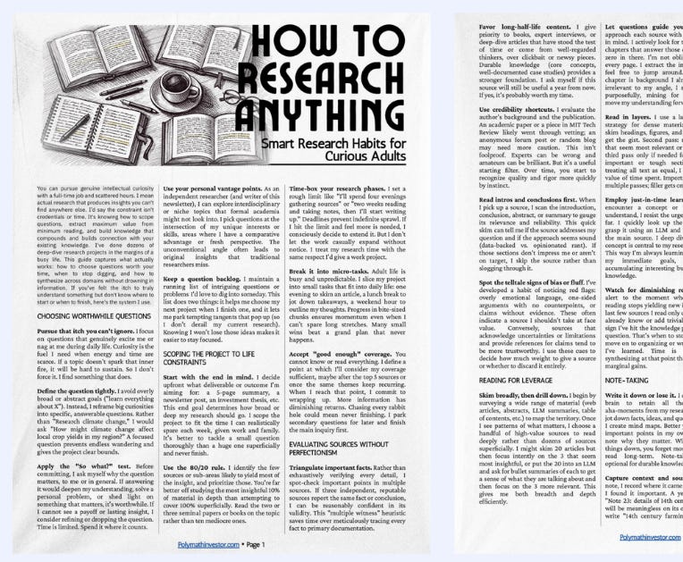 I’ve done dozens of deep-dive research projects in the margins of a busy life. This guide captures what actually works: how to choose questions worth your time, when to stop digging, and how to synthesize across domains without drowning in information. I’ve tried to keep the best practices general: they apply whether you’re researching supply chains, behavioral science, or local history, not just investment themes.